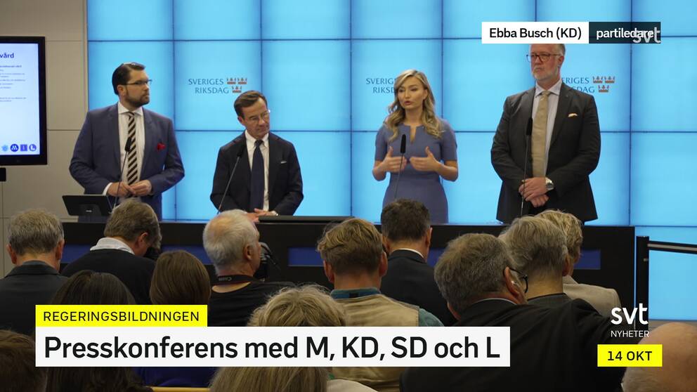 Det blir en regering med Moderaterna Kristdemokraterna och Liberalerna. 8 hours agoKlockan 0930 kommer tillträdande statsminister Ulf Kristersson att läsa upp vilken riktning den nya regeringen kommer att ha. Sverigedemokraterna får stort inflytande över migrations- och kriminalpolitiken.